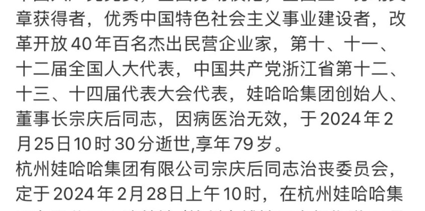 2024年2月25日11点,娃哈哈发布讣告:娃哈哈创始人、董事长宗庆后同志,因病医治无效,于2024年2月25日10时30分逝世,享年79...