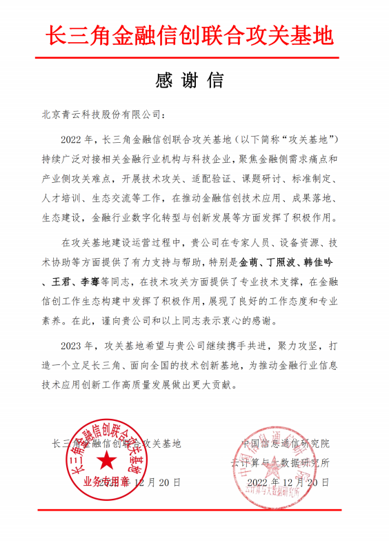 近日,中国信息通信研究院云计算与大数据研究所与长三角 信创联合攻关基地(以下简称:攻关基地)向青云科技发来感谢信。