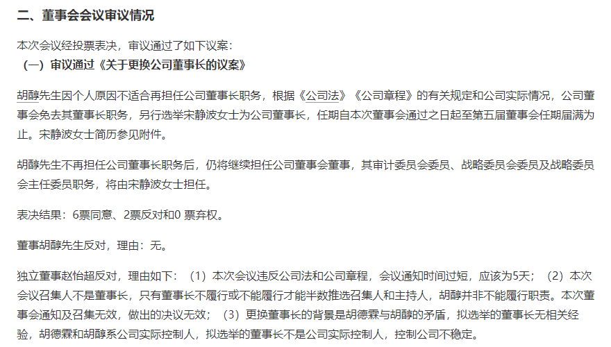 不过,这则选举除获得6票支持外,还收到2票反对。除胡醇无理由反对外,独立董事赵怡超也投下反对票。