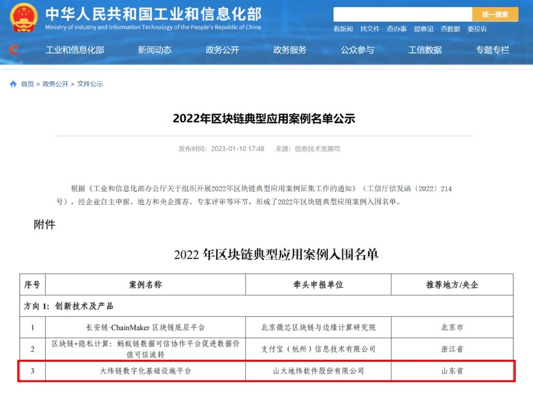 1月10日,国家工业和信息化部公示了《2022年区块链典型应用案例》名单,由山大地纬牵头申报的“大纬链数字化基础设施平台”成功入选,以优秀的成绩位居榜单前三。
