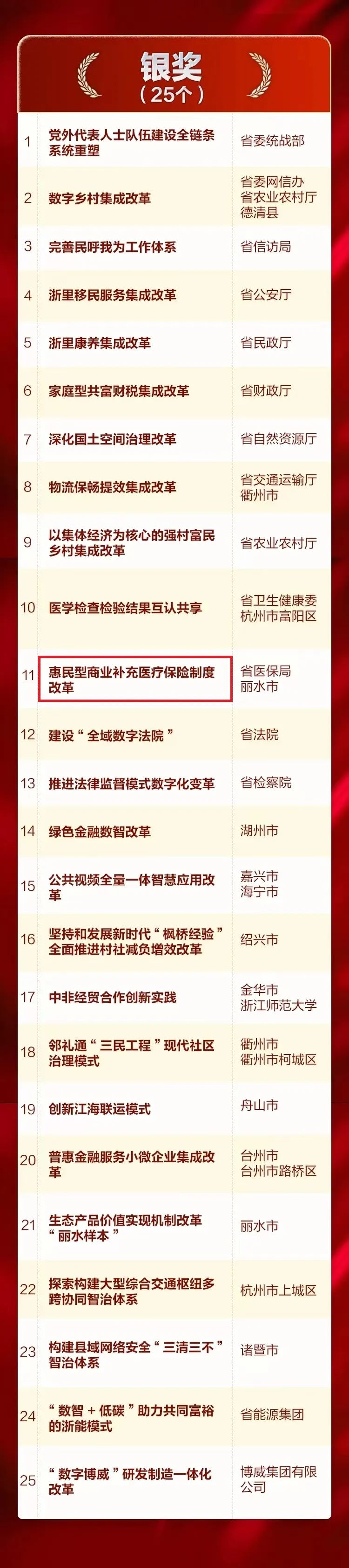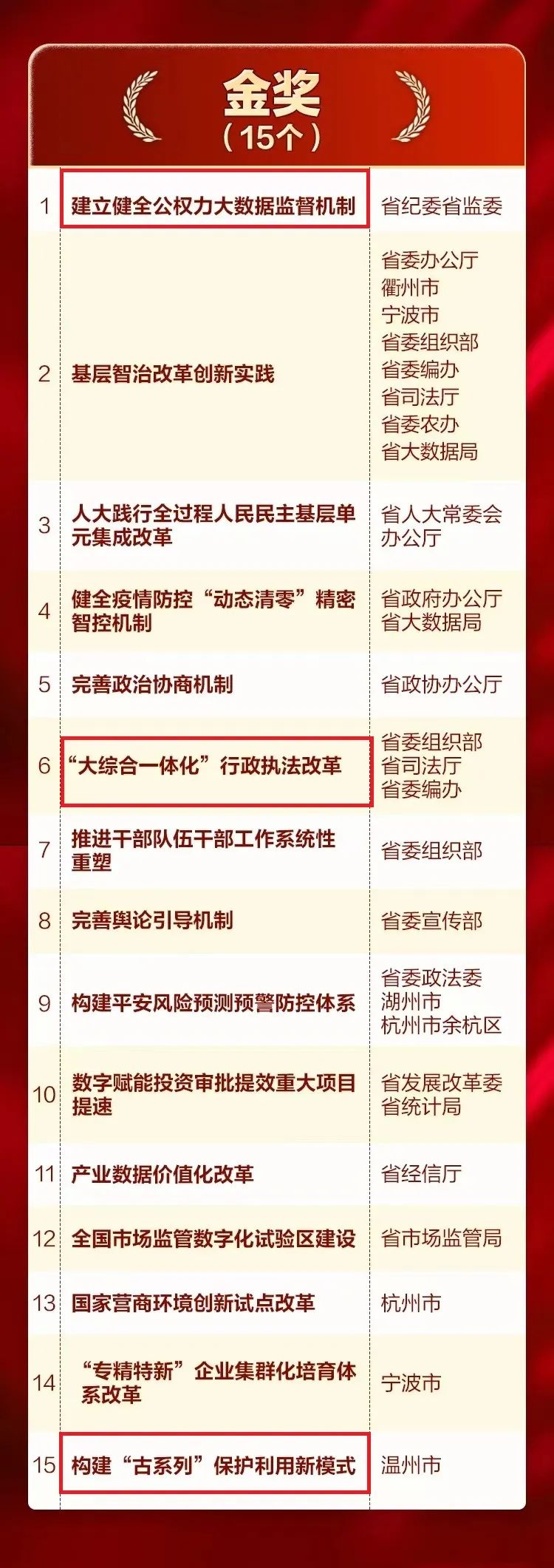 其中,由省委组织部、省司法厅、省委编办主导,汇信科技提供技术支持与服务的“大综合一体化”行政执法改革荣获金奖,网新软件参与打造的“建立健全公权力大数据监督机制”、“构建‘古系列’保护利用新模式两个项目荣获金奖;网新软件承建的“惠民型商业补充医疗保险制度改革”项目荣获银奖;“共富大搬迁”促进城乡一体化改革项目荣获提名奖。