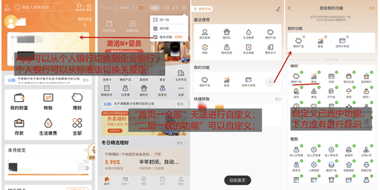 值得注意的是,用户下拉屏幕可以进入“二楼”查看/编辑功能组件,包括我的功能、快捷转账、最近使用、自选基金和热门活动。其中,“我的功能”支持用户自定义0-4个常用功能,但实际仅可显示3个,自定义旅程也有优化空间:已经选中的功能,“全部功能”中没有进行标识。