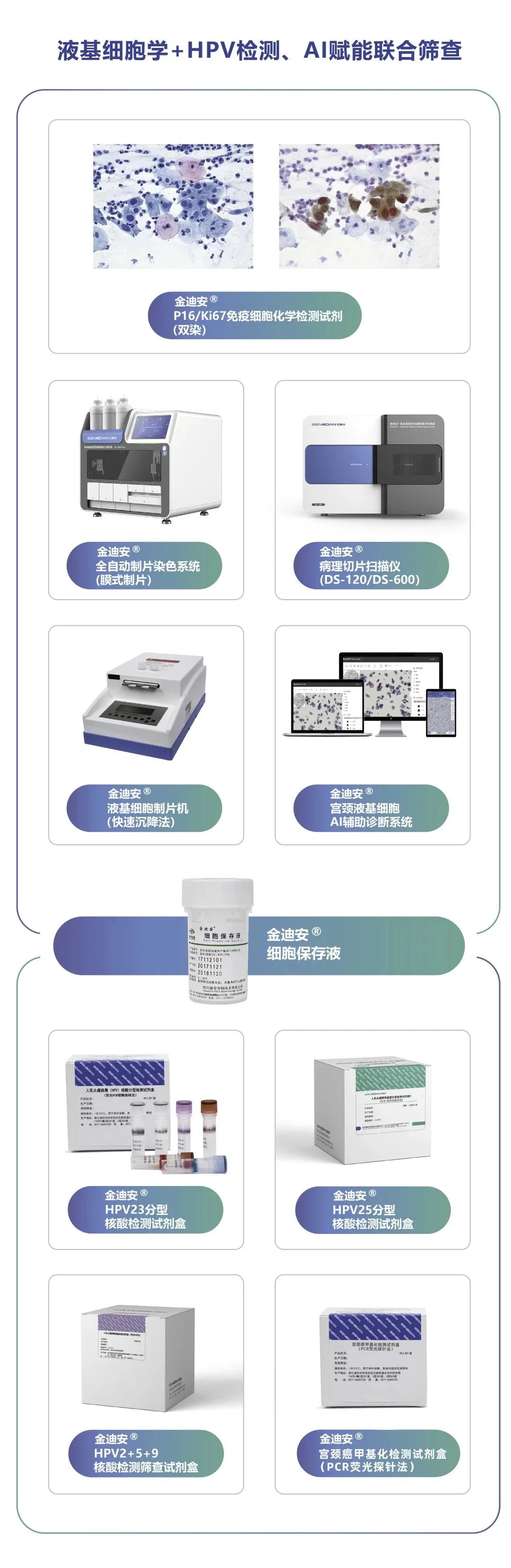 针对HPV病毒检测,迪安生物可提供包含HPV检测、液基细胞学检测、AI辅助阅片系统的宫颈癌筛查整体解决方案。产品包括金迪安 人乳头瘤病毒(HPV)核酸检测、液基细胞学检测系列产品,可实现从样本采样保存、HPV病毒核酸检测及结果判读、液基细胞制片染色及扫描+AI快速识别病变细胞的检测全流程,为实现我国女性宫颈健康管理新目标助力。
