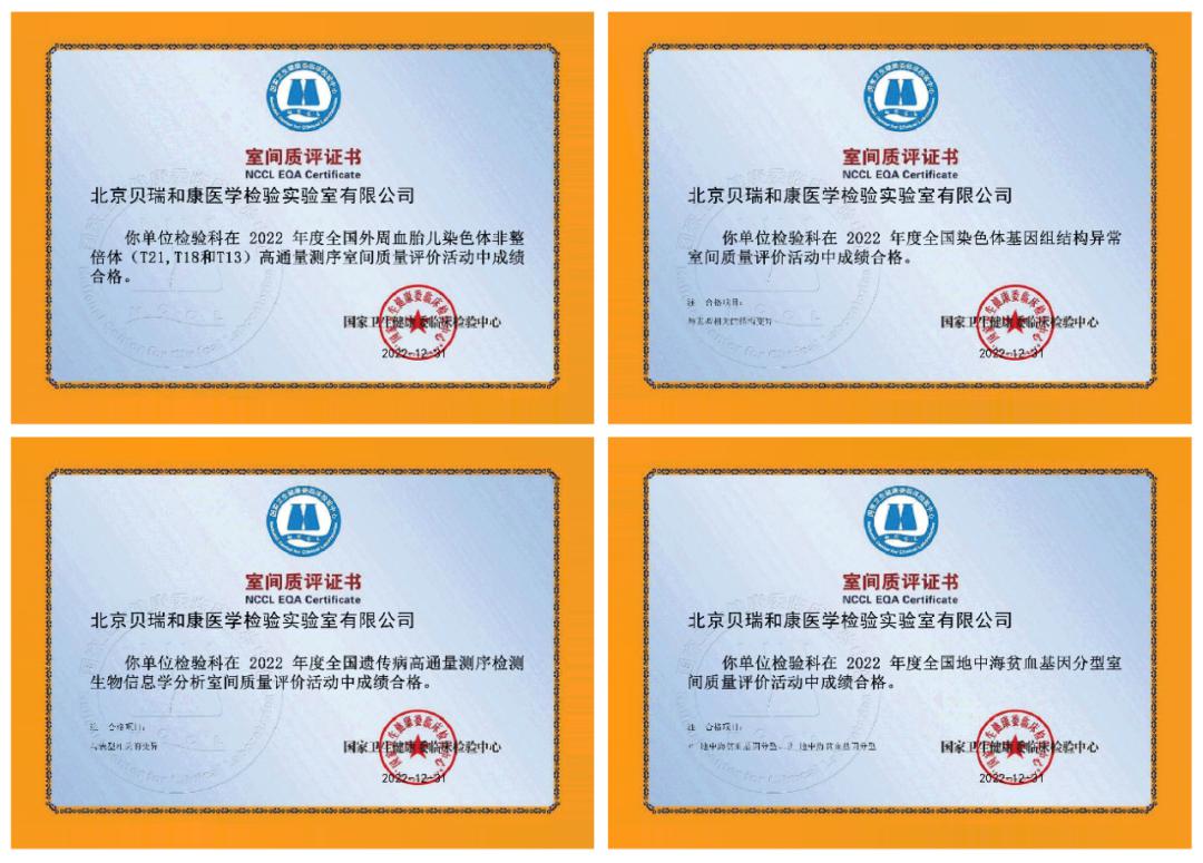 近日,国家卫生健康委临床检验中心(NCCL)公布了2022年全国室间质评结果,贝瑞基因(000710)旗下北京贝瑞和康医学检验实验室(下称“北京医学检验实验室”)外周血胎儿染色体非整倍体(T21,T18和T13)高通量测序、遗传病高通量测序检测生物信息学分析、染色体基因组结构异常、地中海贫血基因分型等十二项质评均顺利通过,同时,贝瑞基因上海、青岛医学检验实验室也均获得合格证书,综合实力再次获权威认证!