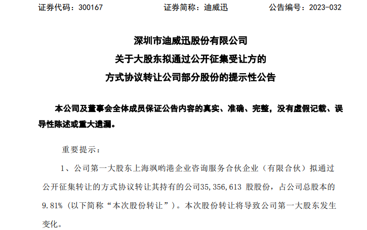 迪威迅2月9日收盘价为5.67元/股,公司表示,上述转让最终交易价格将依据相关法规,以公开征集并在比较各意向受让方报价的基础上确定。意向受让方征集期限为2023年2月10日至2023年3月10日。目前,受让方存在不确定性,若转让得以实施,将导致公司第一大股东发生变更。