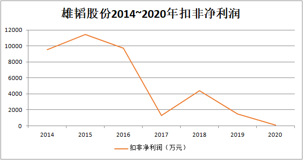 此外,从2014年至2020年,公司实现扣非净利润分别为9503万元、1.14亿元、9659.90万元、1314.42万元、4382.56万元、1502.94万元、98.58万元,同比变动幅度为18.93%、20.18%、-15.42%、-86.39%、233.42%、-65.71%、-93.44%。