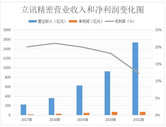 2017-2021年,立讯精密营业收入228.26亿元、358.50亿元、625.16亿元、925.01亿元、1539.46亿元;净利润分别为16.91亿元、27.23亿元、47.14亿元、72.25亿元、70.71亿元。