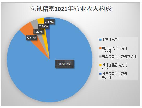 立讯精密以做传统连接线、连接器起家。公司研发、制造及销售的产品主要服务于消费电子、通信及数据中心、汽车电子和医疗等领域。其中消费电子是立讯精密长期以来营业收入的主要组成部分,2021年消费性电子收入占其营业收入的87.46%。