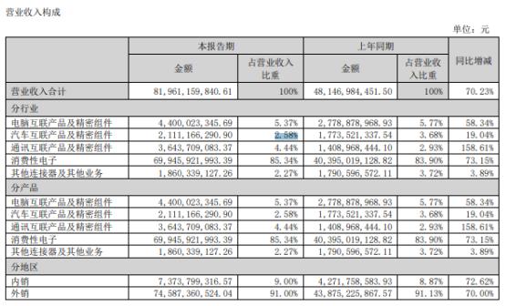 虽然立讯精密已经开始在汽车领域发力,但是从2022年上半年的营业收入构成来看,汽车部分的业务收入占比依然较低。2022年上半年,立讯精密汽车部分的业务收入仍然只有21.11亿元,营业收入占比只有2.58%。消费电子部分的营业收入占比依然高达85.34%。