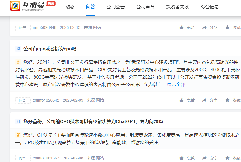此外,对于“CPO”“ChatGPT”的相关问题,通宇通讯与投资者有多次互动。