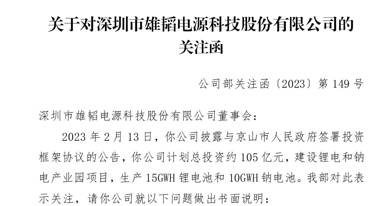 2月14日,市值80多亿的雄韬股份(002733)收到深交所关注函,起因是一则拟将用105亿投资锂电和钠电的消息。