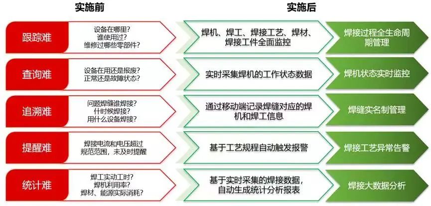 通过这一系统的应用,只需要在屏幕上即可一览车间所有焊机的实时工作状态,并实现焊接全生命周期的监测和管理,实现焊缝实名制管理、焊接质量追溯、焊接过程远程监控和焊接大数据分析,同时为管理者对人员和设备绩效的考核、焊接工艺质量分析、生产过程的资源调度优化、设备的运行维护提供重要的支撑数据。