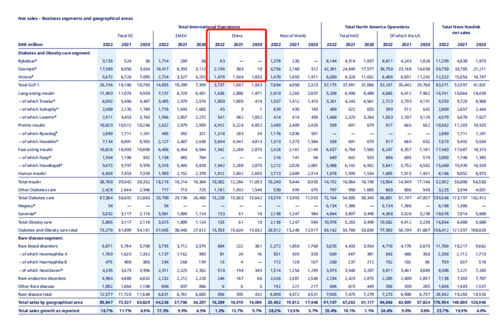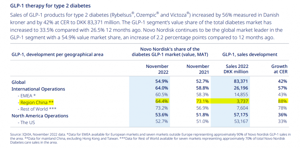 而诺和诺德所开发的利拉鲁肽自问世以来,就成为了诺和诺德抢占GLP-1类似物的市场的“关键”。从诺和诺德2022年财报所公开的中国区销售额中可以看出,诺和诺德GLP-1产品在中国的销售额归功于利拉鲁肽(Victoza)、司美格鲁肽注射剂(Ozempic)和司美格鲁肽口服制剂(Rybelsus)。