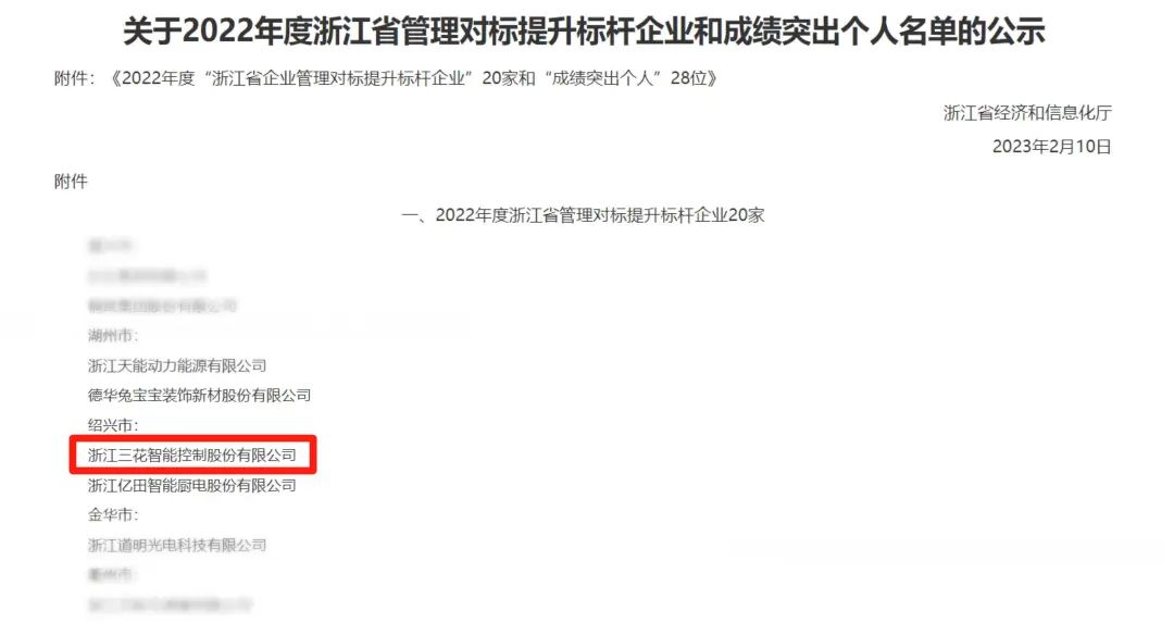 2月13日,浙江省经信厅公布了2022年度浙江省管理对标提升标杆企业名单,认定20家企业为“浙江省管理对标提升标杆企业”,三花智控(002050)荣登榜单。
