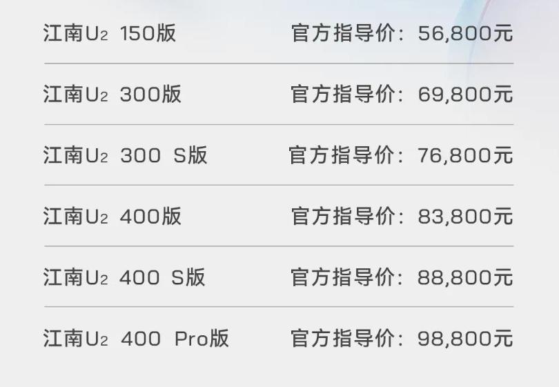 江南U2分为150、300、300S、400、400S、400Pro不同配置共6款车型,CLTC续航里程分为151km、305km、406km三个版本,汇总售价如下: