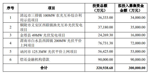 公告显示,经中国证监会《关于核准晶科电力科技股份有限公司公开发行可转换公司债券的批复》(证监许可〔2021〕931号)核准,公司于2021年4月23日公开发行了3,000万张可转换公司债券,发行价格为每张100元,募集资金总额为人民币3,000,000,000.00元,扣除各项发行费用后,实际募集资金净额为2,971,776,415.09元,上述款项已于2021年4月29日全部到账。天健会计师事务所(特殊普通合伙)对公司本次公开发行可转换公司债券的资金到位情况进行了审验,并于2021年4月30日出具了天健验〔2021〕191号《验证报告》。公司已对上述募集资金进行了专户存储。公司《公开发行可转换公司债券募集说明书》披露的募集资金投资计划如下:
