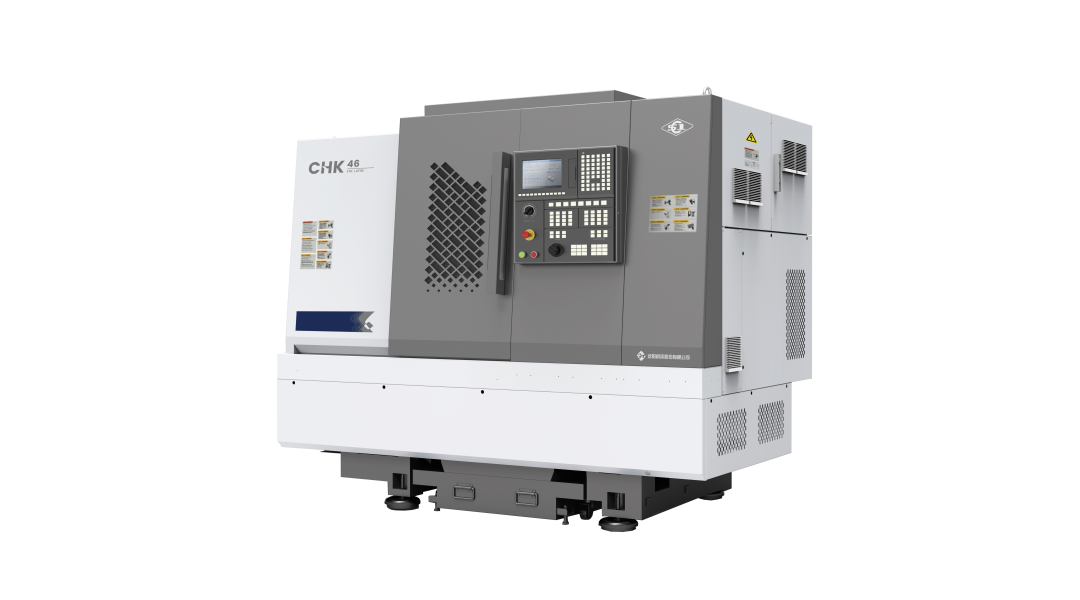 CHK46数控排刀车床采用75°斜床身设计,内部采用三角筋型,抗扭能力强,保 证了机床刚性;采用热对称结构主轴箱设计,可以有效抵消热变形影响;主电机 传动带中线垂直于X轴方向,减小了传动带拉力对X向切削精度的影响。切削区域下方布置大倾斜角度排屑孔,排屑顺畅,不易积屑;主电机设置独立风道,便于散热,有效减少了电机热量对机床精度的影响;创新型的电箱布置使得整机配重更加均衡。机床外形美观,整机结构紧凑,占地空间小。