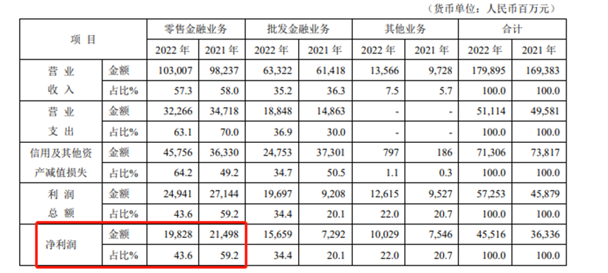 不过,2022年该行的零售业务利润和利润占比都出现了下滑。
