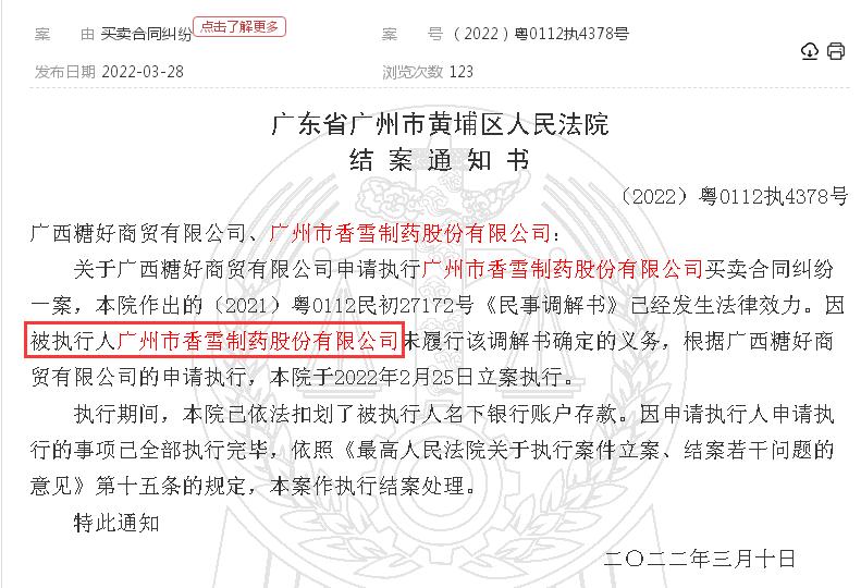 其中,《广东省广州市黄埔区人民法院结案通知书(2022)粤0112执4378号》显示,关于广西糖好商贸有限公司申请执行广州市香雪制药股份有限公司买卖合同纠纷一案,广东省广州市黄埔区人民法院作出的(2021)粤0112民初27172号《民事调解书》已经发生法律效力。因被执行人广州市香雪制药股份有限公司未履行该调解书确定的义务,根据广西糖好商贸有限公司的申请执行,本院于2022年2月25日立案执行。