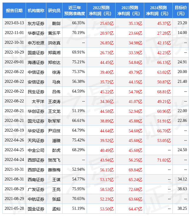 数据中心根据近三年发布的研报数据计算,广发证券王亮研究员团队对该股研究较为深入,近三年预测准确度均值为75.95%,其预测2022年度归属净利润为盈利58.53亿,根据现价换算的预测PE为9.76。
