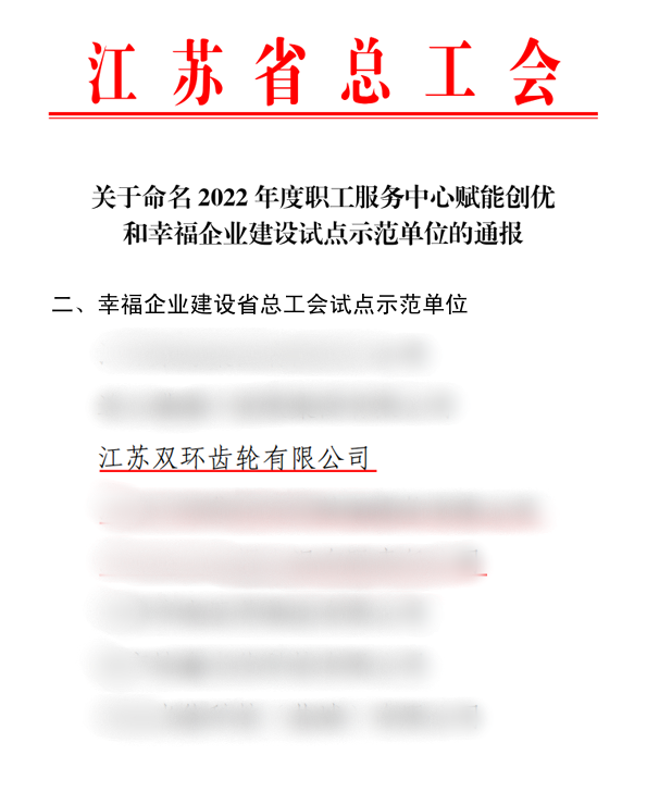 近日,江苏省总工会办公室印发通知,公布了2022 年度幸福企业江苏省总工会试点示范单位名单。江苏双环经过自评、初审、调研评估和集中评审后,成功入选江苏省第一批“幸福企业试点示范单位”。