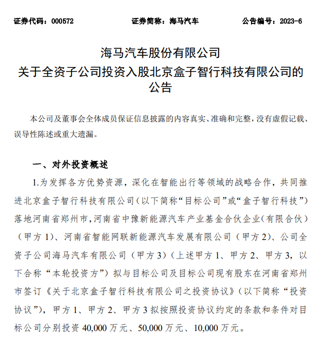 3月23日,海马汽车(000572)公告显示,拟投资入股北京盒子智行科技有限公司。