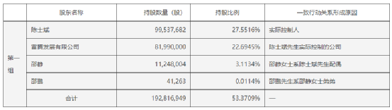 陈士斌和邵静实际上一致行动人,两人为夫妻关系,加上富腾发展和邵静弟弟邵鹏的股份,陈士斌夫妇控制的股份比例为53.37%。