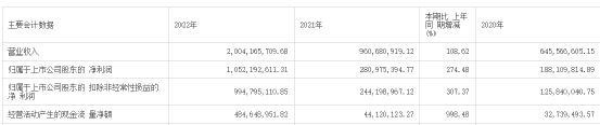公司2022年实现营业收入达到20亿元,同比增长108%,跟2020年相比更是大增超200%;实现净利润10.52亿元,实现扣非净利润9.95亿元,上述数据同比和与2020年相比的增速分别为274%、459%及307%、690%。