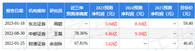 数据中心根据近三年发布的研报数据计算,中邮证券王磊研究员团队对该股研究较为深入,近三年预测准确度均值为78.36%,其预测2023年度归属净利润为盈利6.86亿,根据现价换算的预测PE为9.04。