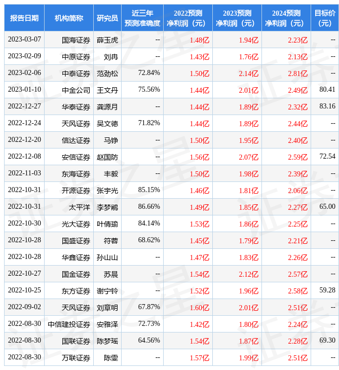数据中心根据近三年发布的研报数据计算,太平洋李梦鹇研究员团队对该股研究较为深入,近三年预测准确度均值高达86.66%,其预测2022年度归属净利润为盈利1.49亿,根据现价换算的预测PE为47.79。