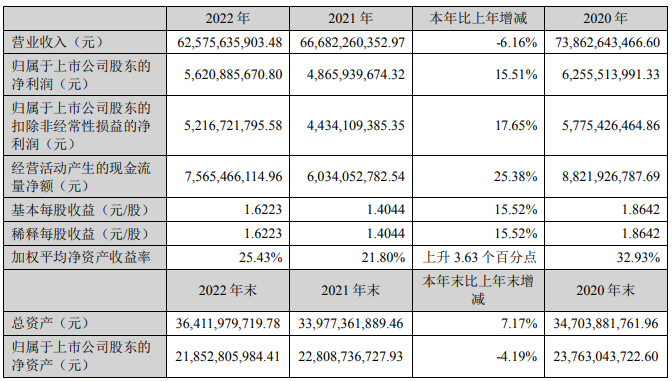 双汇发展于昨日晚间发布2022年年度报告,公司2022年实现营业收入625.76亿元,同比下降6.16%;归属于上市公司股东的净利润为56.21亿元,同比增长15.51%;归属于上市公司股东的扣除非经常性损益的净利润为52.17亿元,同比增长17.65%;经营活动产生的现金流量净额为75.65亿元,同比增加25.38%。