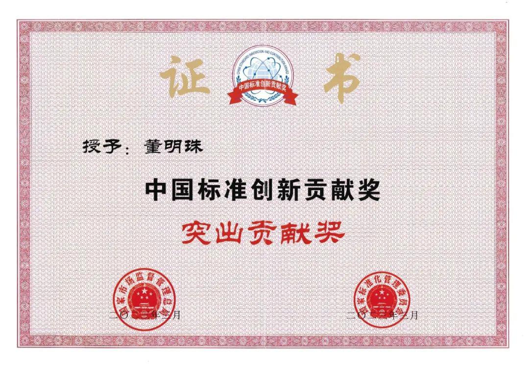 中国标准创新贡献奖是由国家市场监督管理总局(国家标准化管理委员会)设立,并经中央批准的我国标准化领域的权威奖项,其范围覆盖全国各个行业的标准化领域。该奖项每两年评选1次,其中突出贡献奖每次限额4名,用于表彰为我国标准化事业做出突出贡献的个人。