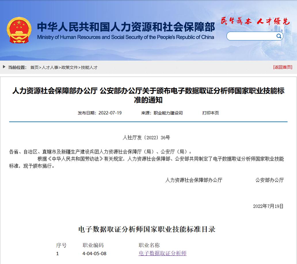 2021年3月,人力资源社会保障部会同国家市场监督管理总局、国家统计局正式发布了18个新职业,其中就包括“电子数据取证分析师”。人社部表示,随着数字技术的快速发展,犯罪行为也变得越来越依赖数字设备和网络,电子数据取证分析师等这些新职业对于促进数字经济健康发展,提高司法效率,保护企业安全,提高证据质量和打击犯罪具有重要意义。