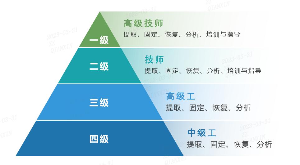 电子数据取证分析师技能等级:本职业共设四个等级,分别为:四级/中级工、三级/高级工、二级/技师、一级/高级技师。