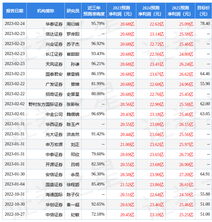 数据中心根据近三年发布的研报数据计算,兴业证券苏子杰研究员团队对该股研究较为深入,近三年预测准确度均值高达96.92%,其预测2023年度归属净利润为盈利20.68亿,根据现价换算的预测PE为21.15。