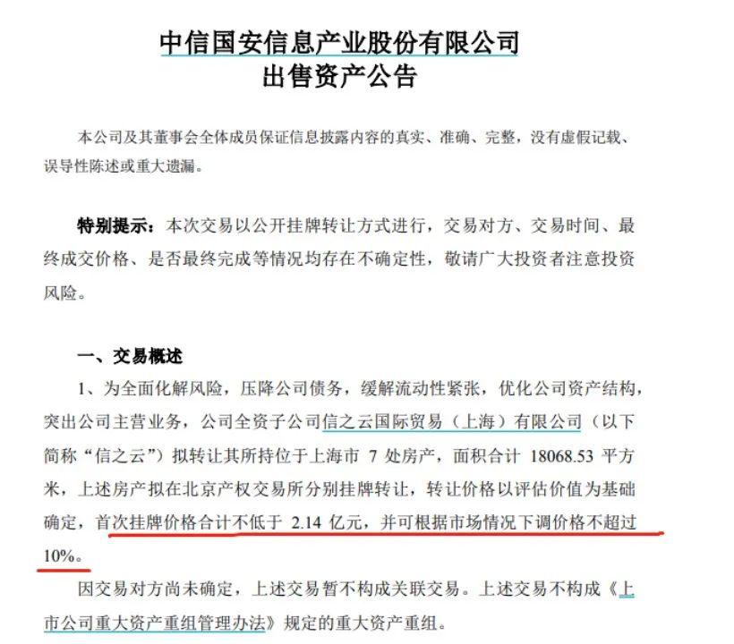 根据ST国安4月3日发布的公告,为全面化解风险,压降公司债务,缓解流动性紧张,优化公司资产结构,突出公司主营业务,公司全资子公司信之云国际贸易(上海)有限公司(以下简称“信之云”)拟转让其所持位于上海市7处房产,面积合计18068.53平方米,上述房产拟在北京产权交易所分别挂牌转让,转让价格以评估价值为基础确定,首次挂牌价格合计不低于2.14亿元,并可根据市场情况下调价格不超过10%。