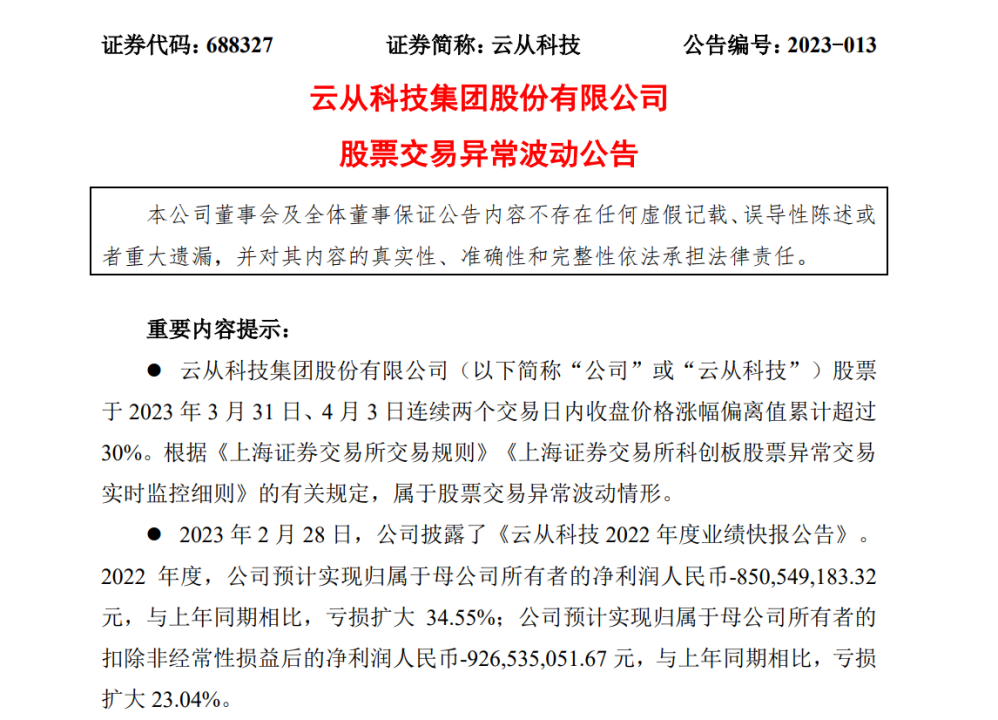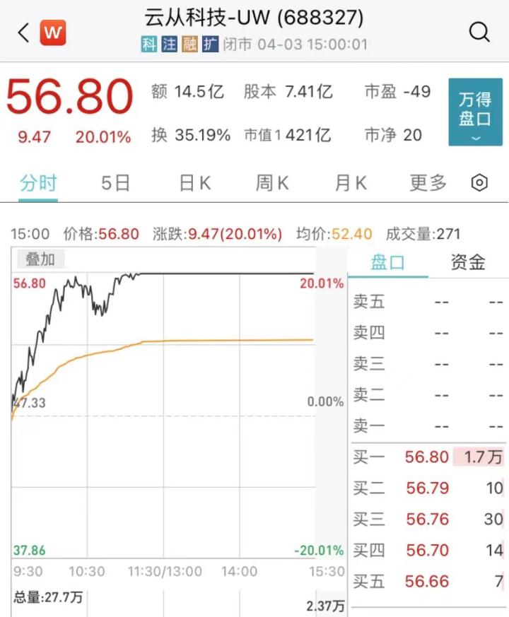 4月3日,云从科技盘中涨停,截至目前该股报56.8元,总市值为421亿元。3月31日、4月3日连续两个交易日内收盘价格涨幅偏离值累计超过30%,属于股票交易异常波动情形。