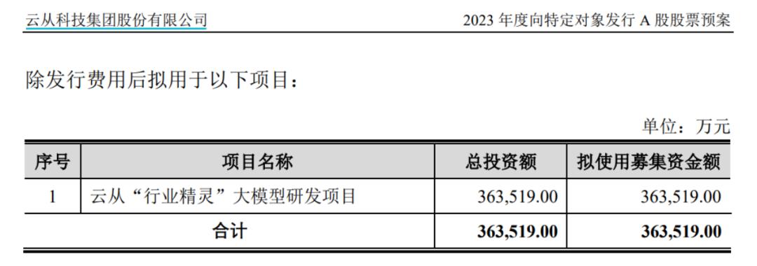 值得一提的是,云从科技发布2023年度向特定对象发行A股股票预案。本次发行的募集资金总额不超过人民币36.35亿元(含本数),扣除发行费用后拟用于云从“行业精灵”大模型研发项目。