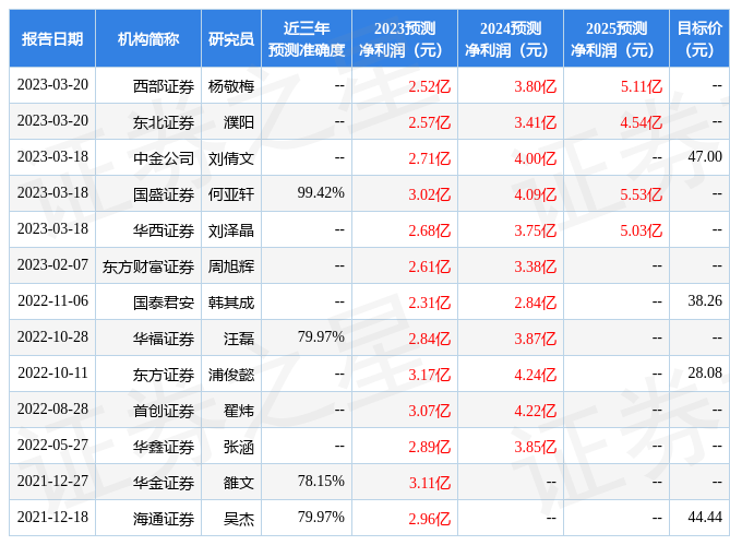 数据中心根据近三年发布的研报数据计算,国盛证券何亚轩研究员团队对该股研究较为深入,近三年预测准确度均值高达99.42%,其预测2023年度归属净利润为盈利3.02亿,根据现价换算的预测PE为26.95。