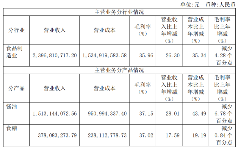 千禾味业方面表示,2022年,受采购成本上升影响,酱油、食醋的毛利率同比均下降。