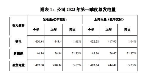 4月9日消息,中国核电(601985)发布一季度发电量完成情况,公司2023年一季度累计商运发电量497亿千瓦时,同比增长5.67%;上网电量467.64亿千瓦时,同比增长5.23%。
