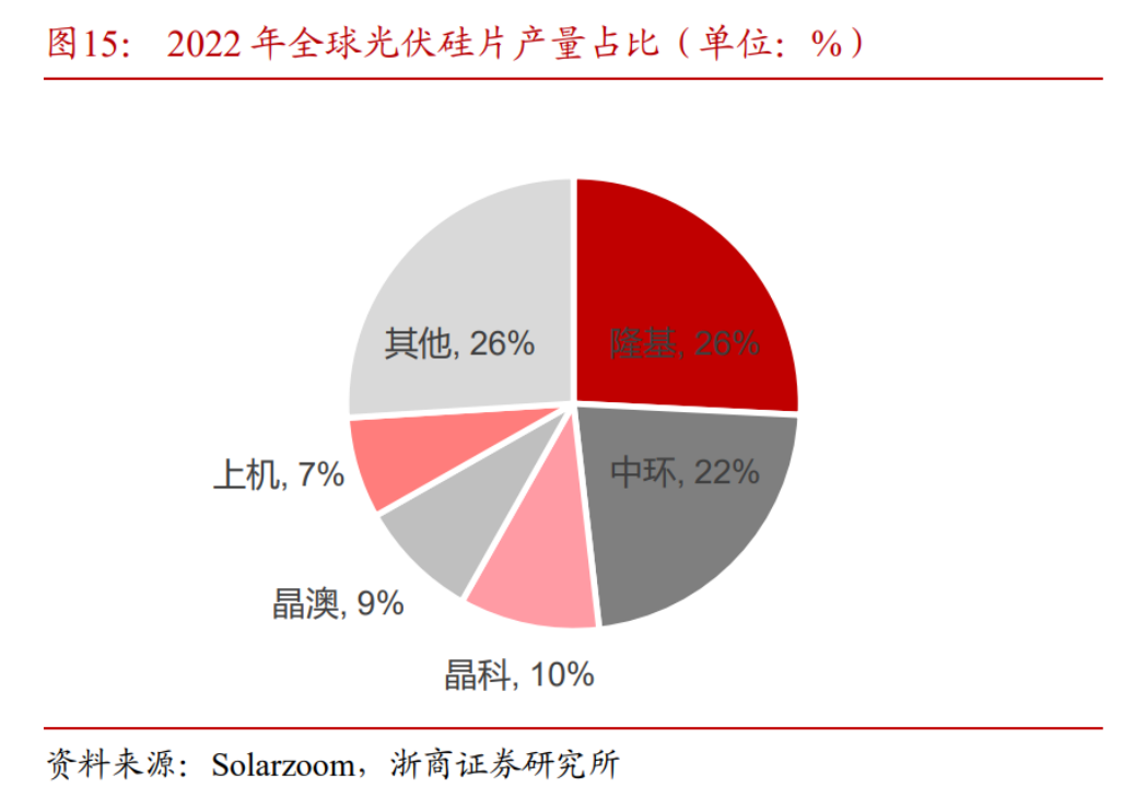 根据Solarzoom统计数据显示,隆基绿能和TCL中环2022年硅片产量分别占据整个市场26%和22%,合计占据整个市场产能近五成。较其他二线生产企业有显著的规模优势,其余一体化公司或者硅片生产企业产量占比约为5%-10%。