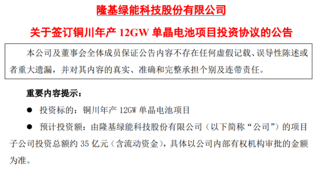 隆基绿能10日披露,其4月8日与铜川市人民政府、铜川新材料产业园区管理委员会签订单晶电池项目投资合作协议,拟在陕西省铜川新材料产业园区投资建设年产12GW单晶电池项目。项目投资总额约35亿元(含流动资金),预计2024年下半年开始投产,2024年底达产。