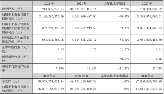 北京4月13日讯 东方雨虹(002271)(002271.SZ)于昨日晚间发布2022年年度报告,公司2022年实现营业收入312.14亿元,同比下降2.26%;归属于上市公司股东的净利润为21.20亿元,同比下降49.57%;归属于上市公司股东的扣除非经常性损益的净利润为18.03亿元,同比下降53.39%;经营活动产生的现金流量净额为6.54亿元,同比减少84.11%。