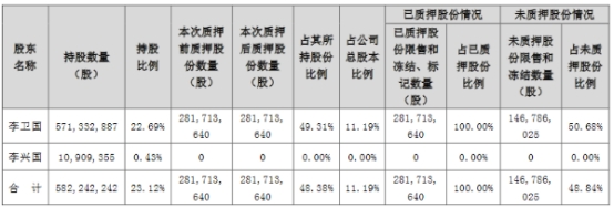 李卫国及其一致行动人李兴国合计持有公司股份582,242,242股,占公司总股本的23.12%,完成本次部分股份质押展期后,累计质押所持公司股份为281,713,640股,占公司总股本的11.19%,占其所持公司股份的48.38%。