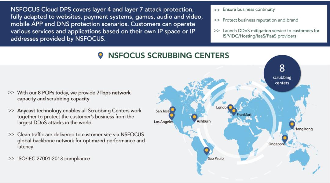 绿盟科技在全球8个数据中心搭建了云清洗平台,通过Anycast技术,绿盟科技国际云清洗服务可实现全球节点联合近源清洗。2019年新增巴西圣保罗节点,提供T级云端DDoS防护能力。
