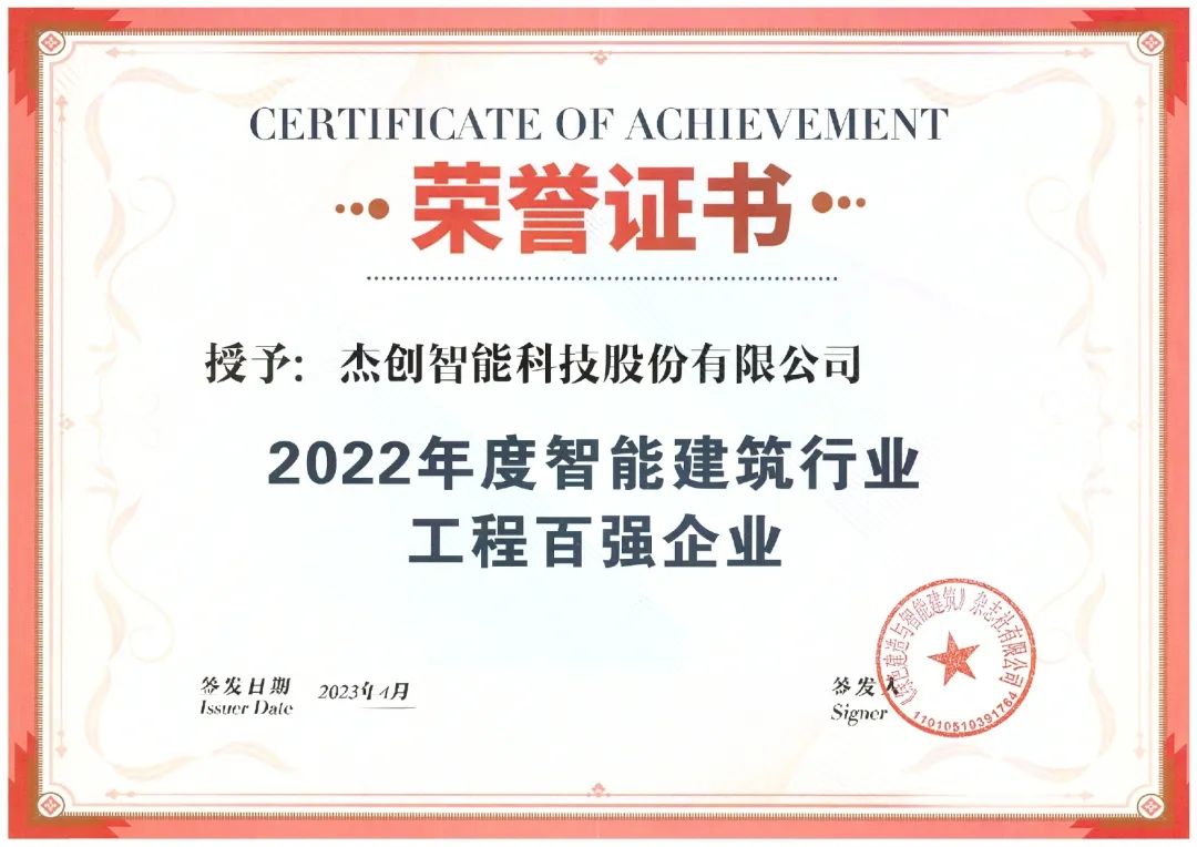 公司被授予“2022年度智能建筑行业工程百强企业”。
