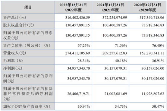 财务方面,于2020年度、2021年度及2022年度,公司实现营业收入分别约为1.52亿元、2.09亿元、2.74亿元。公司净利润分别约为3015.70万元、3015.71万元、3495.73万元人民币。