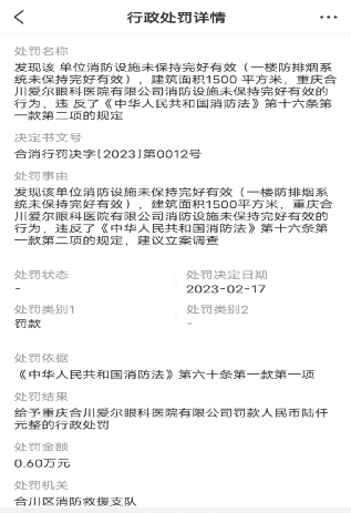 去年12月15日,广州越秀区消防大队向广州爱尔开出行政处罚,金额不大,只有5000元,但显示的问题并不算小,为“人员密集场所使用不合格消防产品逾期未改”。今年2月,重庆合川爱尔眼科医院也吃到罚单,原因是“发现该单位消防设施未保持完好有效,建筑面积1500平方米”。