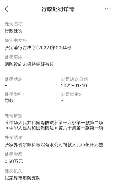 天眼查信息显示,去年1月张家界爱尔眼科医院也被当地消防部门检查出问题并处罚,原因也是“消防设施未保持完好有效”。去年11月,河北邯郸大名县爱尔眼科医院被罚9000元,原因同样是“消防器材未保持完好有效”。去年9月28日,九江爱尔眼科医院被处罚,原因则是电灯的线路未进行套管保护,且未整改。
